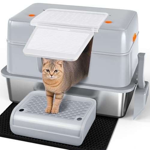 Citylifehouse Citylife XL Stainless Steel Cat Litter Tray with Lid, Extra Large Enclosed Metal Box Scoop&Double Layer Mat, Non-Sticky,