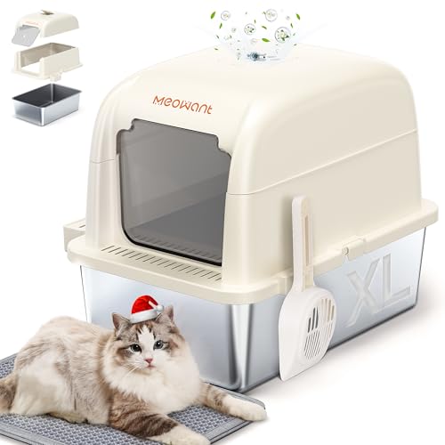 MeoWant Cat Litter Box with High Side Stainless Steel with Lid, Enclosed Metal Litter Pan for Big Cat, Never Absorbs Odor, Non Stick Surface, XXL Extra Large Litter Tray, Detachable, Easy Clean, White