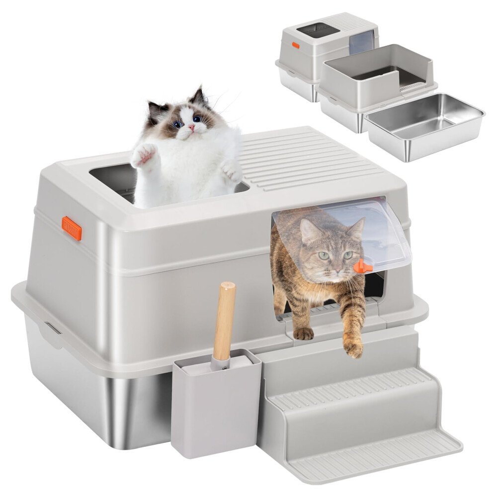 SZEETECH XL Enclosed Stainless Steel Litter Box, Odour-Resistant, Easy to Clean, Dual-Mode (Enclosed & Semi-Enclosed), Cat Litter Tray with Lid, with