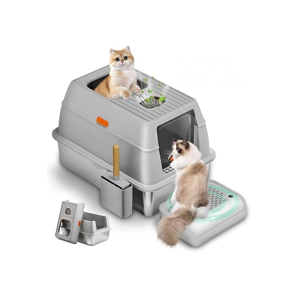 Ventilation Stainless Steel Cat Litter Tray with Lid, Detachable Enclosure Litter Tray with Odour Control,Including Scoop&Peda, XXL High Sided Litter
