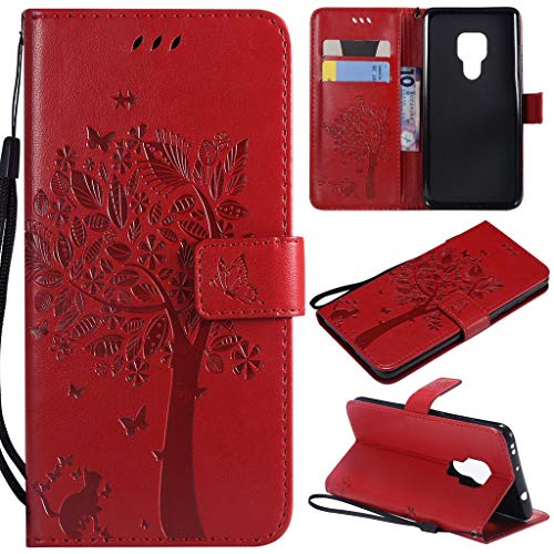 SATURCASE Case for Huawei Mate 20, Cat Tree Embossing PU Leather Flip Magnet Wallet Stand Card Slots Protective Cover with Hand Strap for Huawei Mate 20 (Red)