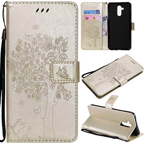 SATURCASE Case for Huawei Mate 20 Lite, Cat Tree PU Leather Flip Magnet Wallet Stand Card Slots Protective Cover with Hand Strap for Huawei Mate 20 Lite (Gold)