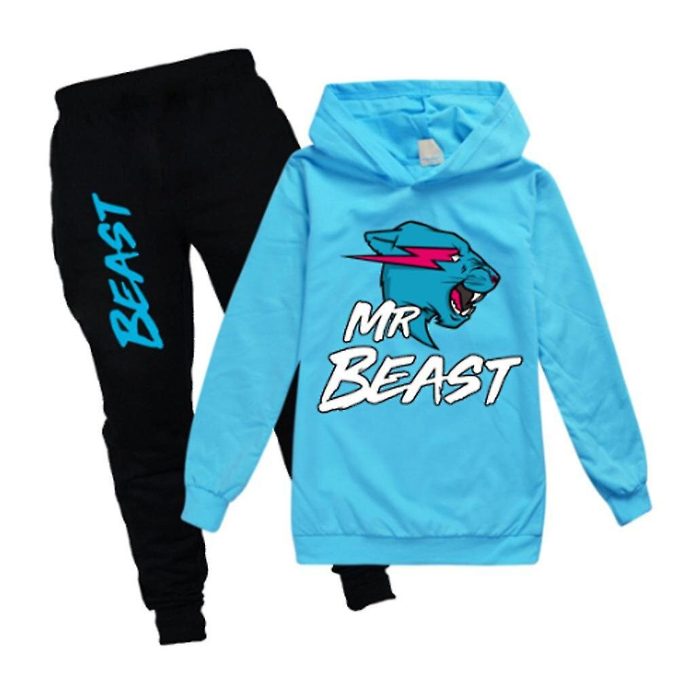 (Light Blue, 9-10 Years) Otwoo Otwoo Kids Boys Girls Mr Beast Lightning Cat Print Outfits Casual Hoodies Tops Jogger Pants Tracksuit Set 7-14 Years