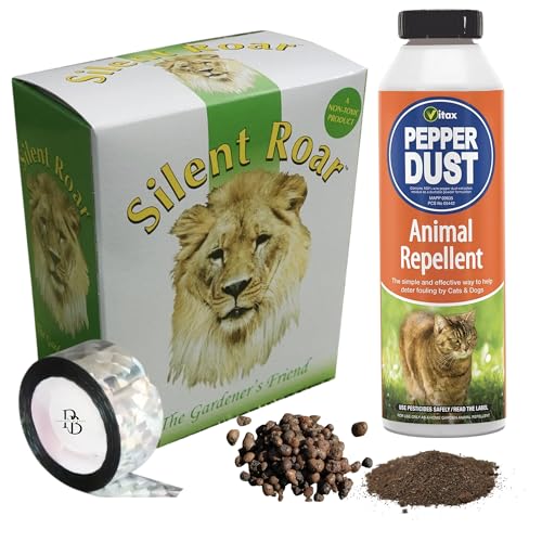 Cat Deterrent for Gardens UK – Silent Roar Lion Dung Pellets, Pepper Dust & Reflective Tape Bundle – Cat Repellent to Stop Cats Pooping in Garden Areas