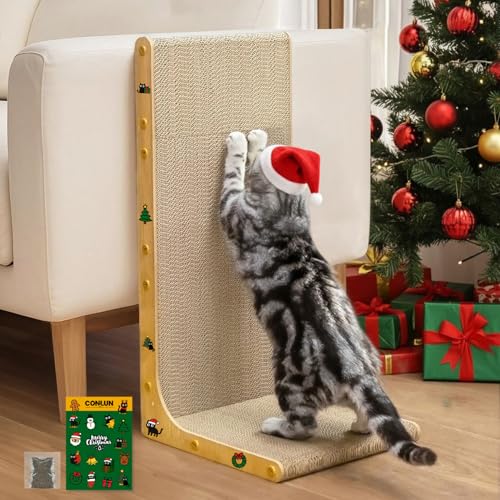 Conlun Cardboard Cat Scratcher,58 cm L Shape Scratch Pad Wall Mounted,Vertical Scratching Post Durable Cardboard to Protect Furniture for Indoor Cats,Wood Grain Large