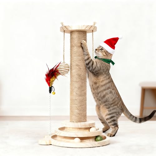 MORA PETS Cat Scratching Post for Indoor Cats with Solid Wooden Base Cat Scratche Post with Interactive Track Ball Toys Kitten Small Scratcher Post Funny Cat Scratch Pole 45cm