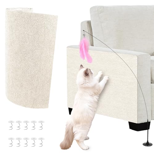 CxutSa 40x100cm Cat Scratching Mat Self Adhesive Scratch Pad Anti Scratch Furniture Protector DIY Trimmable Climbing Cat Scratcher for Sofa, Wall, Floor, Carpet with Cats Feather Toy (Off-white)