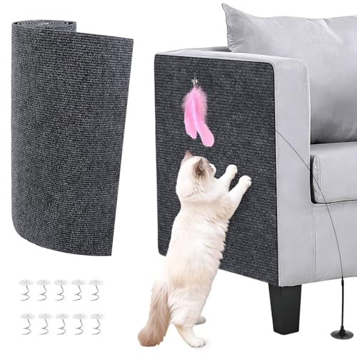 CxutSa 40x100cm Cat Scratching Mat Self Adhesive Scratch Pad Anti Scratch Furniture Protector DIY Trimmable Climbing Cat Scratcher for Sofa, Wall, Floor, Carpet with Cats Feather Toy (Grey)