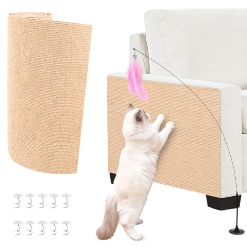 CxutSa 40x100cm Cat Scratching Mat Self Adhesive Scratch Pad Anti Scratch Furniture Protector DIY Trimmable Climbing Cat Scratcher for Sofa, Wall, Floor, Carpet with Cats Feather Toy (Khaki)