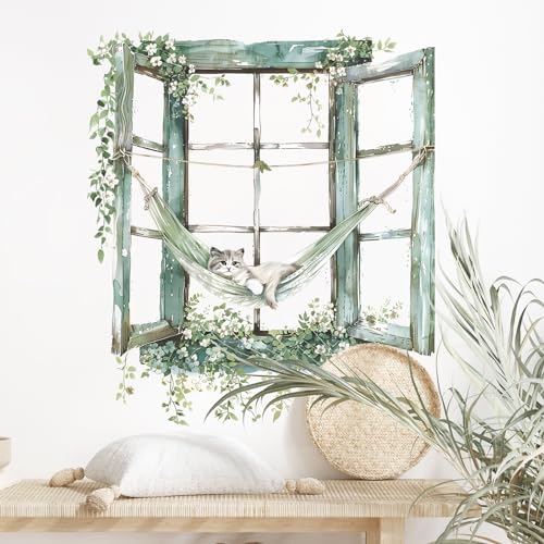 Supzone Fake Window Wall Stickers, Sleeping Cat on Hanging Hammock Wall Decals, Peel and Stick Vinyl Wall Art Decor for Living Room Bedroom Furniture Cabinet Decor