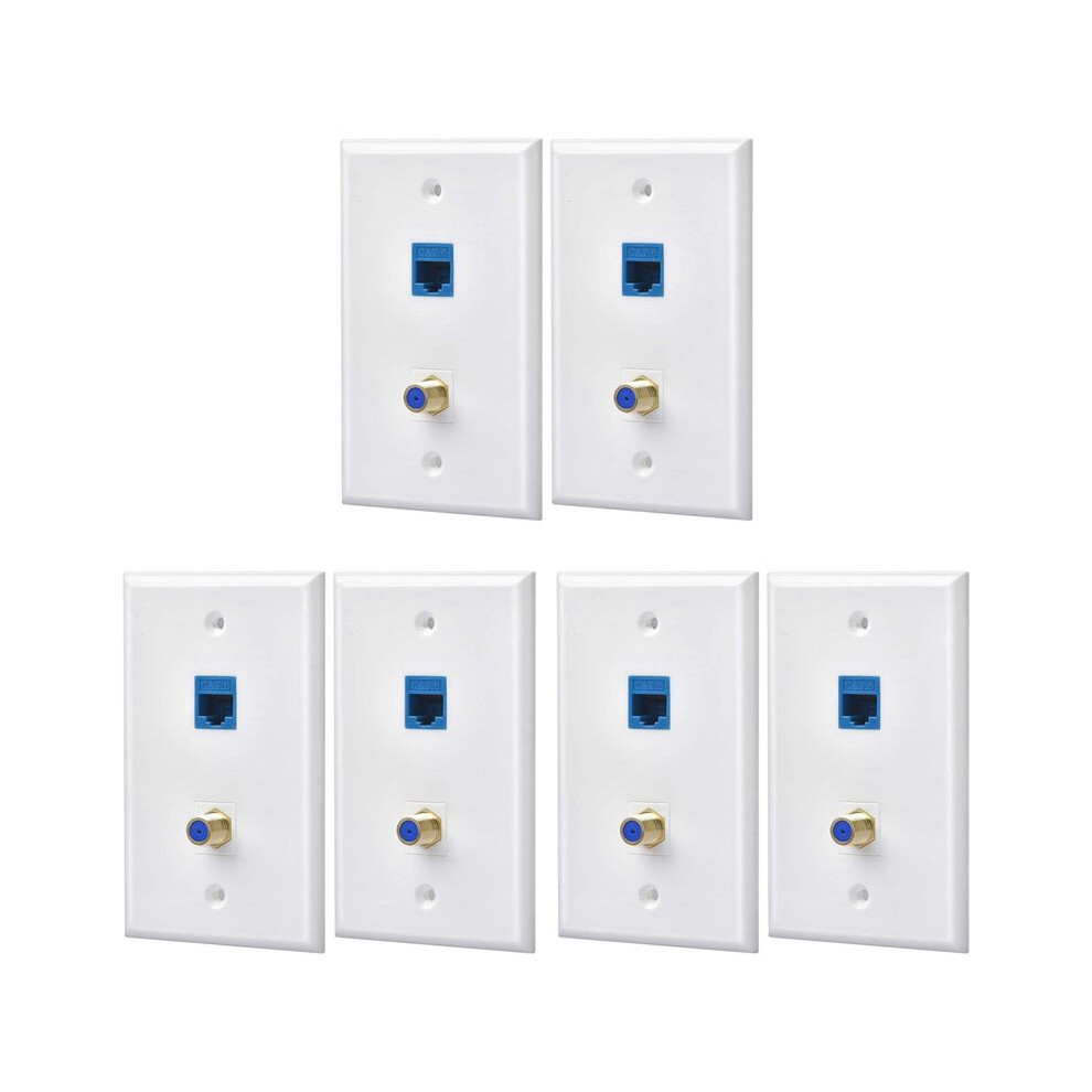 6 Packs Ethernet Coax Wall Plate Outlet with 1 Cat6 Keystone Port and 1 Gold-Plated Coax F Type Port RJ45 Wall Plates