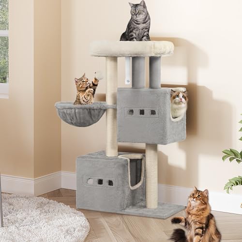 Hzuaneri Cat Tree, 98 cm Tower, Sisal Scratching Post, Cats Tower for Indoor, Multi-Level Stable Cat Tree with Cats House, 2 Caves, Pompoms, Light Grey MS10018LGV1