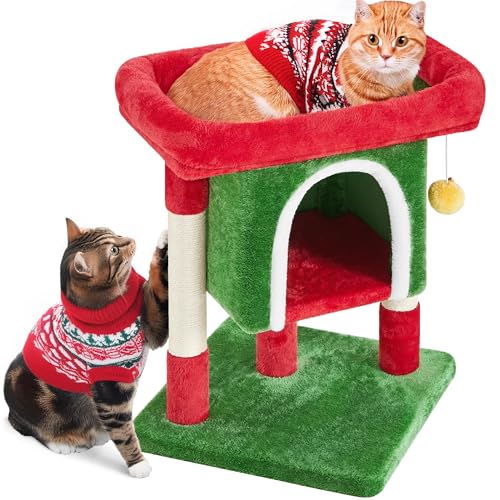 Yaheetech Christmas Themed Cat Tree Tower for Kitten Cats, Pet Standing House with Sisal-Covered Top Platform Spacious Condo Detachable Dangling Ball, Pet Activity Center, Red/Green