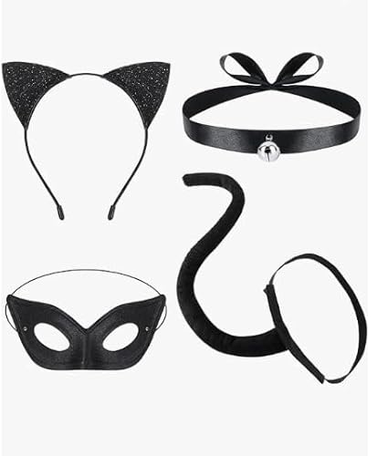 EduPlayte 4pcs Black Cat Costume Set for Women, Sequins Black Cat Ears Cat Tail Masquerade Eye Cover Tail, Catwoman Costume Accessories for Women Halloween Cosplay