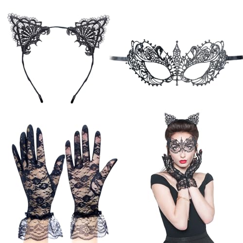 GWAWG Cat Ear Headband, Lace Eye Mask & Gloves Set, Catwoman Costume Accessories for Women Adults, Halloween Masquerade Party Role Play