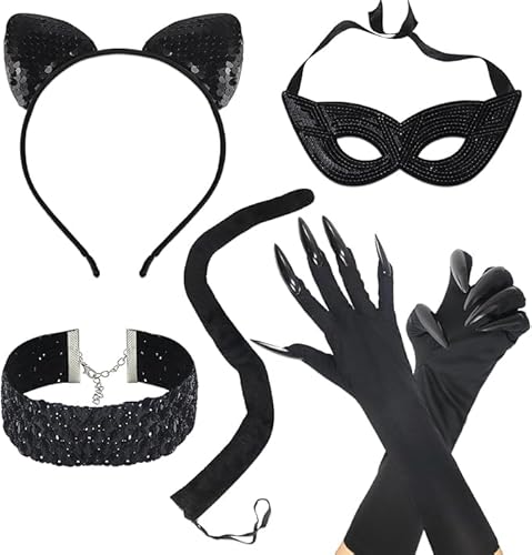 Owdenuy 6PCS Black Cat Costume Set, Cat Tail Masquerade Sequins Black Cat Ears Mask Cat Claw Gloves Choker, Catwoman Costume Accessories for Women Halloween Cosplay