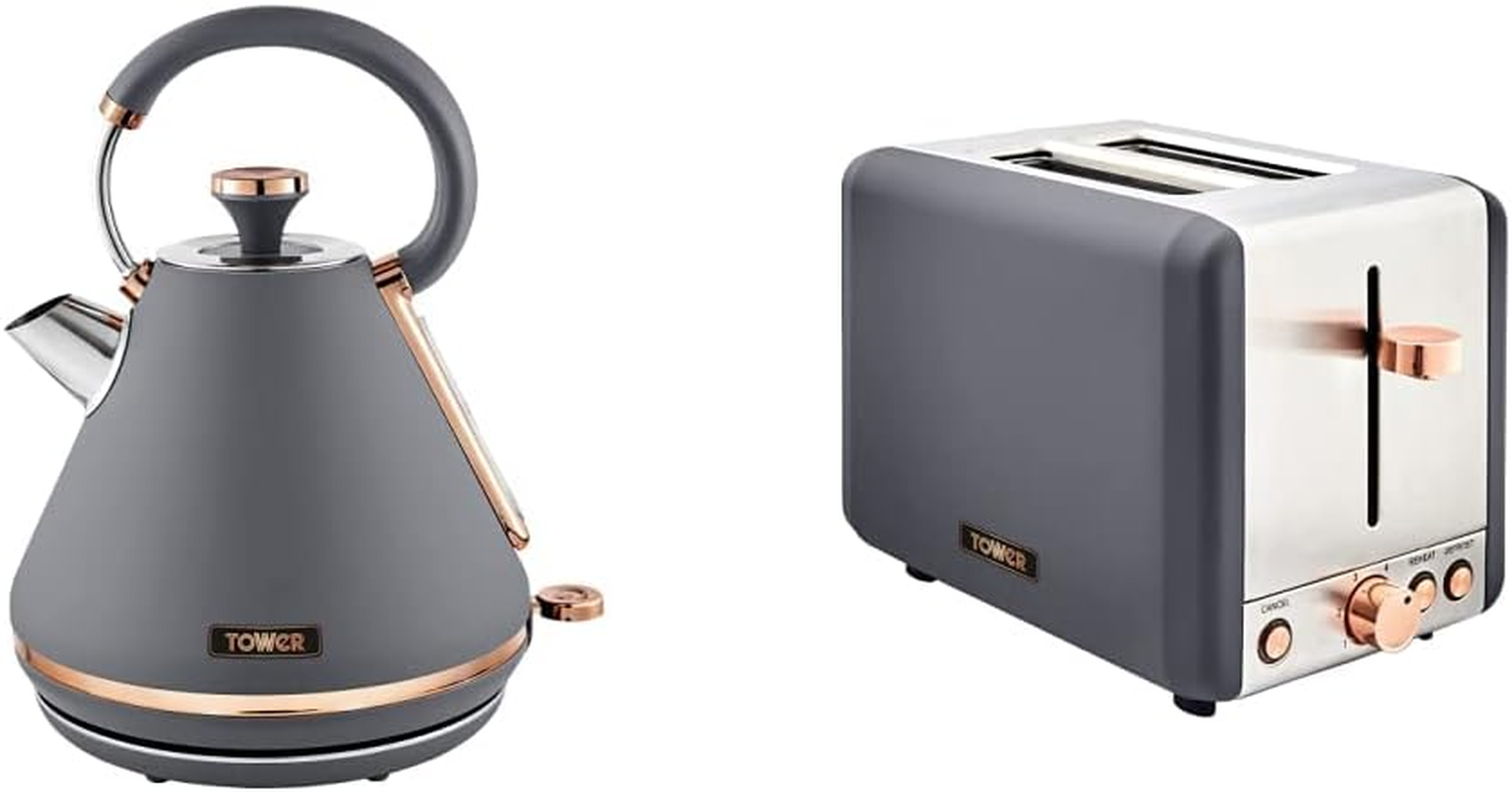 Tower T10044RGG Cavaletto Pyramid Kettle with Fast Boil, Grey and Rose Gold & T20036RGG Cavaletto 2-Slice Toaster with Defrost/Reheat, Stainless Steel, 850 W, Grey and Rose Gold