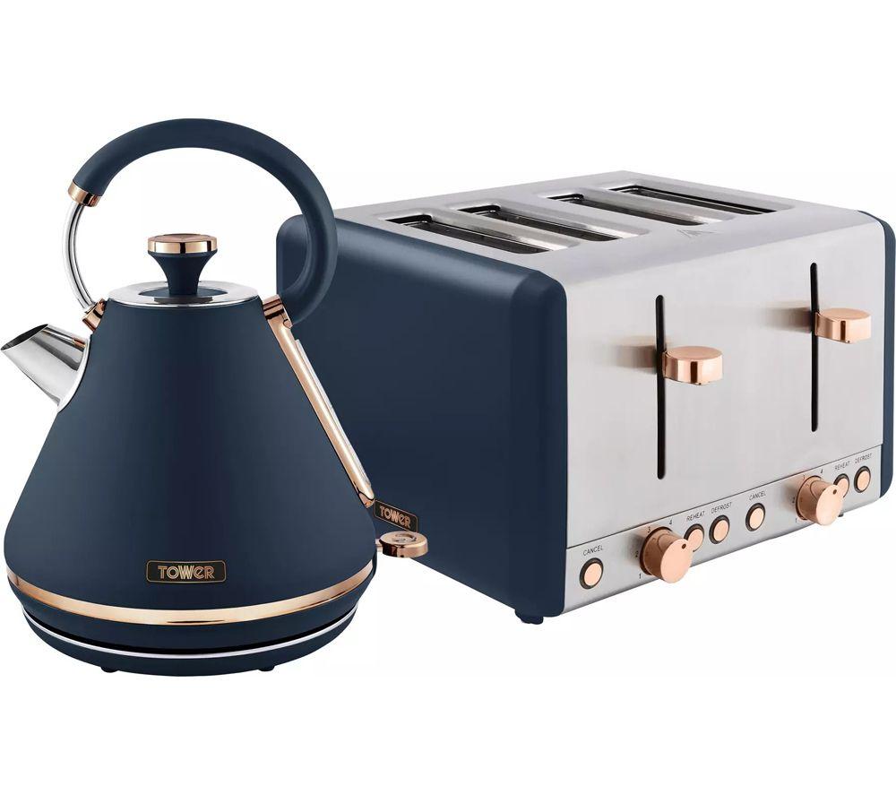 Tower T20051MNB Cavaletto 4-Slice Toaster with Defrost/Reheat & T10044MNB Cavaletto Pyramid Kettle with Fast Boil, Detachable Filter, 1.7 Litre, Midnight Blue and Rose Gold