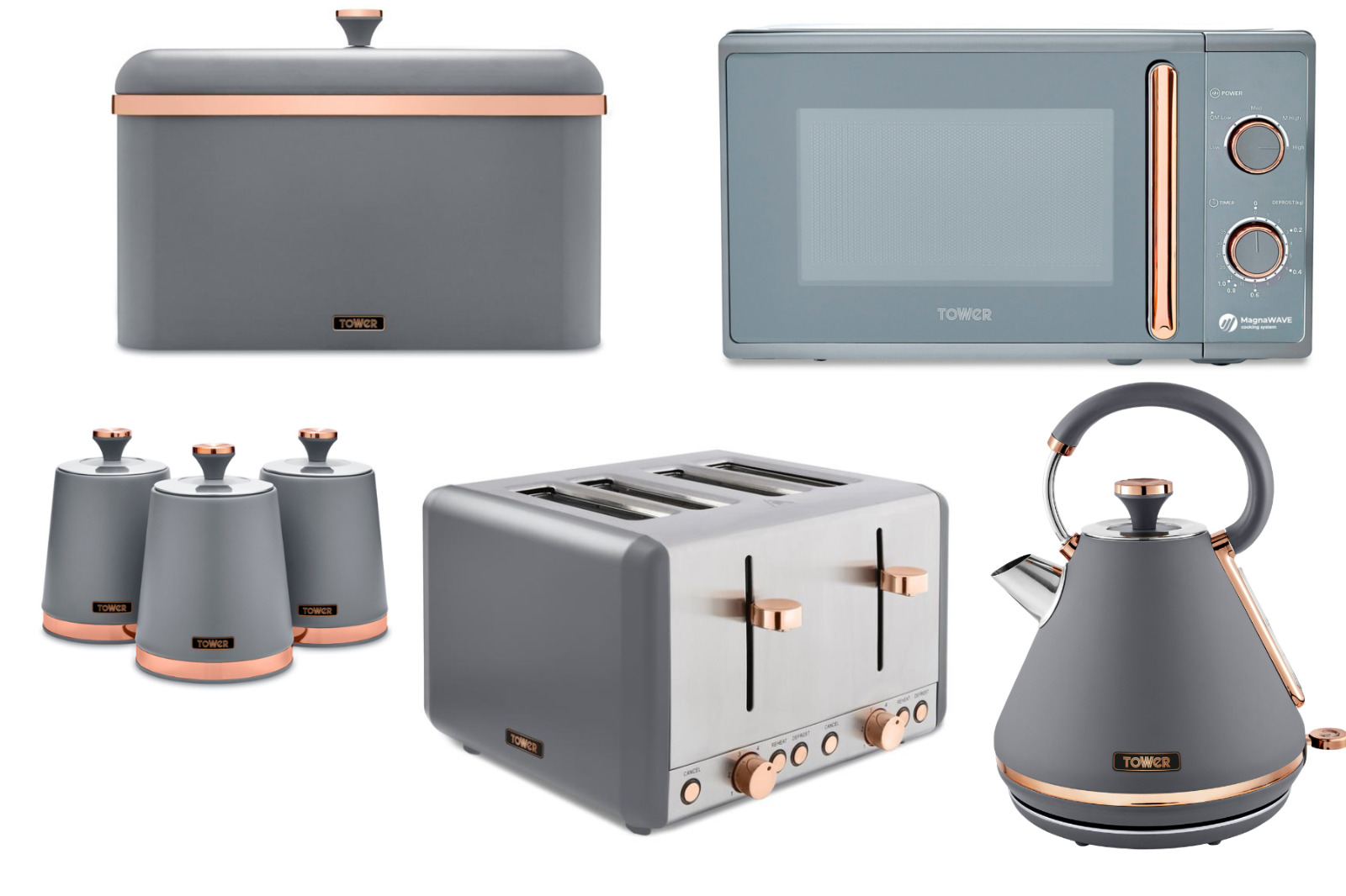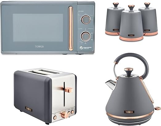 Tower Cavaletto Grey Pyramid Kettle 4 Slice Toaster Microwave Breadbin Canisters