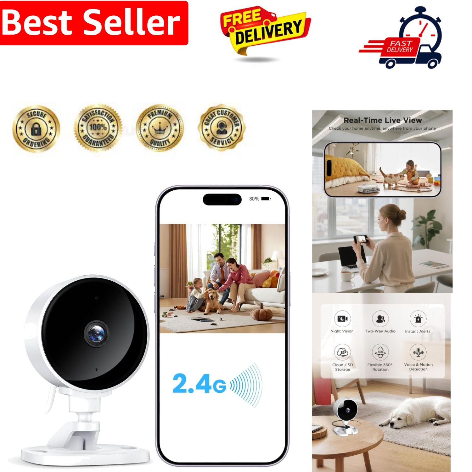 WOLFANG 1080P Indoor Security Camera, Mini WiFi CCTV Camera for Home Security, Night Vision, Motion Detection, Two Way Audio, 2.4G WiFi, SD & Cloud Storage, Alarm Alert