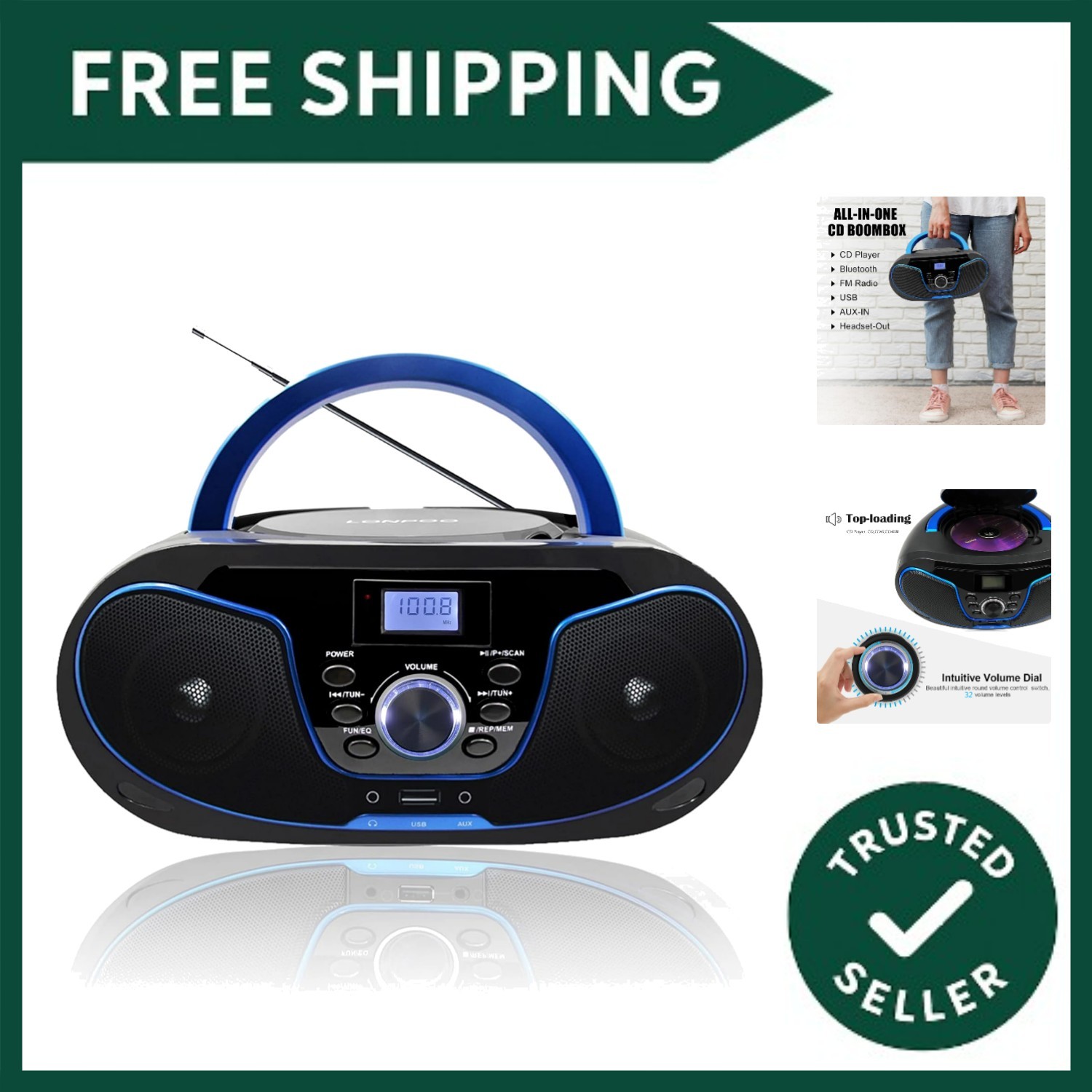 LONPOO Portable Boombox CD Player Stereo Sound with FM Radio, USB, Bluetooth, AU