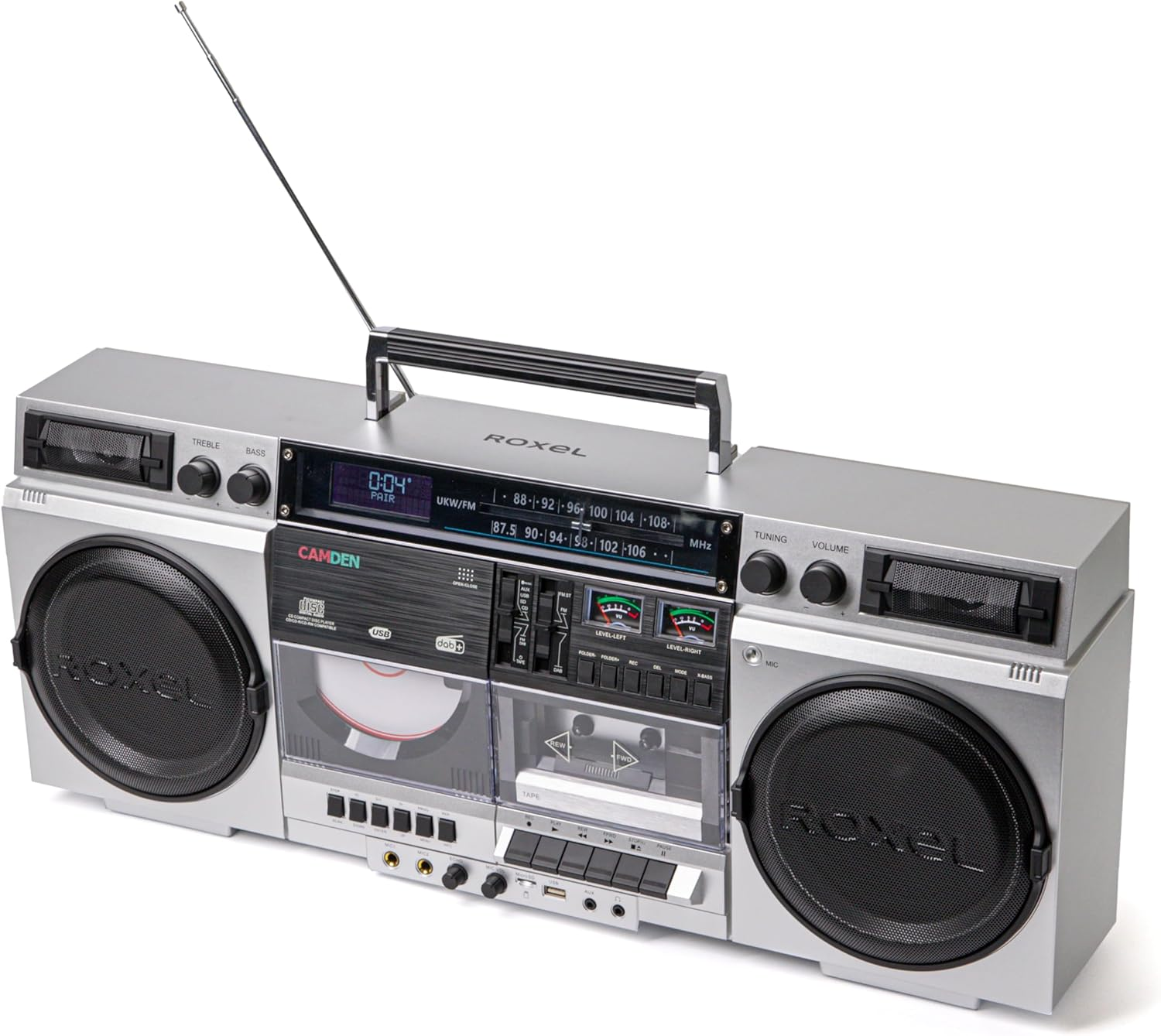 Roxel Camden Retro Cassette CD Player Boombox with DAB/FM Radio, Portable Vintage Player, BT 5.3, USB/TF/SD Playback, Mains Power, Headphone Jack, Vintage Design (Silver)