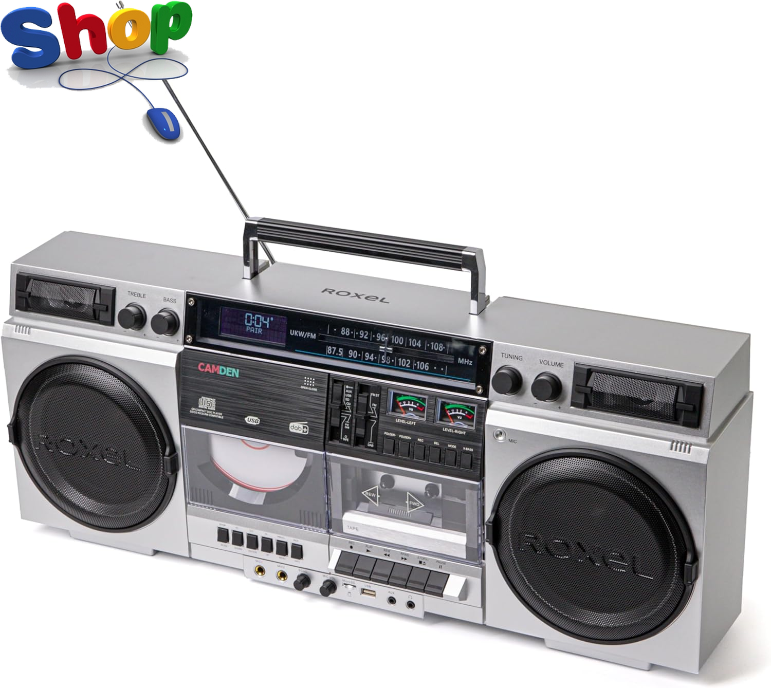 (Silver) Roxel Camden Cassette CD Player Boombox with Radio