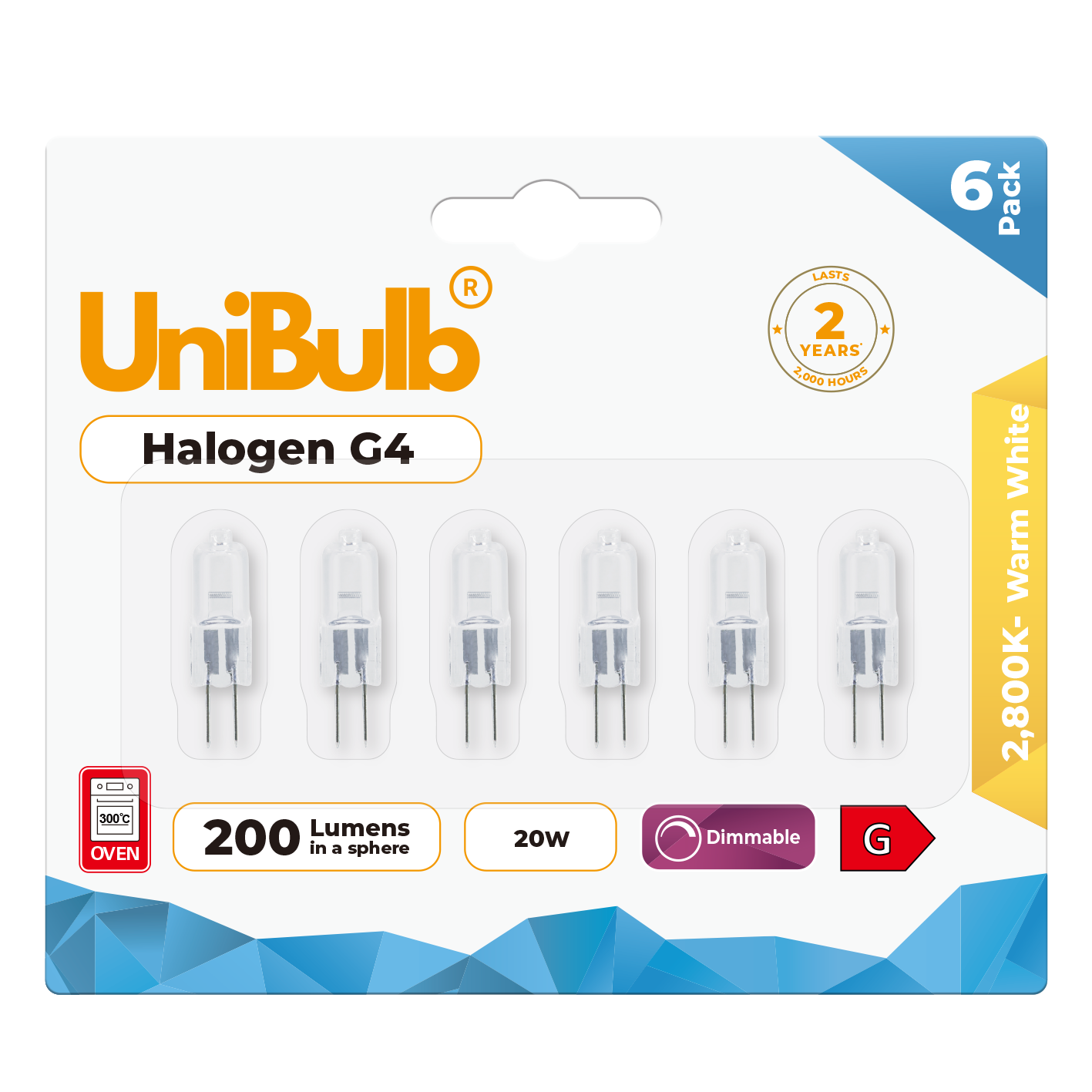 6x UniBulb Halogen G4 20W Warm White Bulbs for Cooker Hoods & Ceiling Lights
