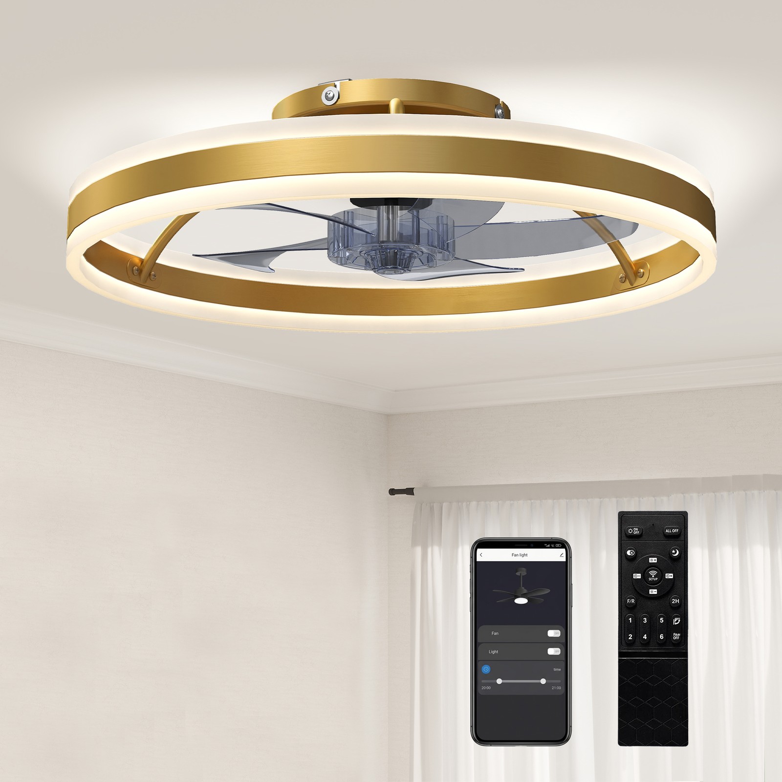 (4 Fans) Remote control silent fan light, Ceiling Fans with Lights, Low Profile Indoor Ceiling Fan with Light and Remote Control, Flush Mount, LED Dim