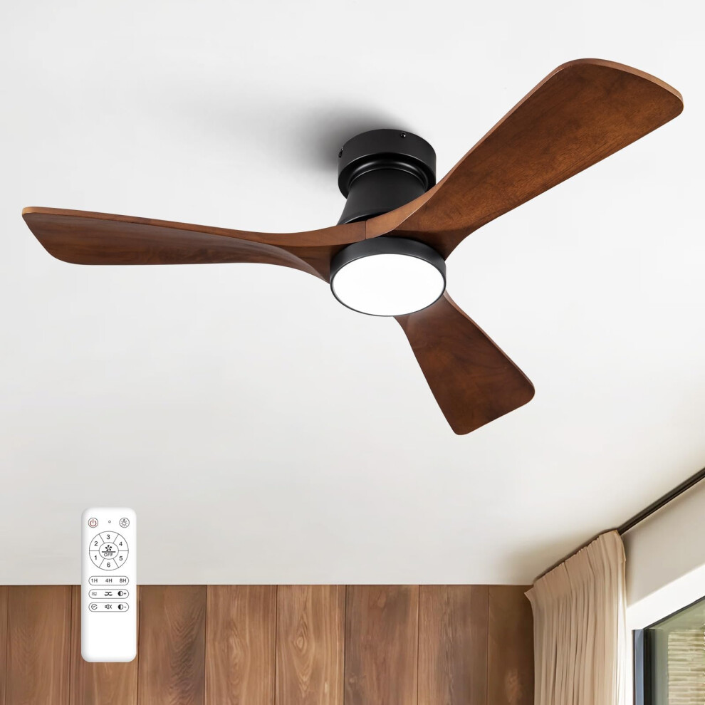 42 Inch Flush Mount Ceiling Fan with Lights and Remote, Quiet DC Motor, Dimmable LED, Reversible Wood Blades, Black Walnut