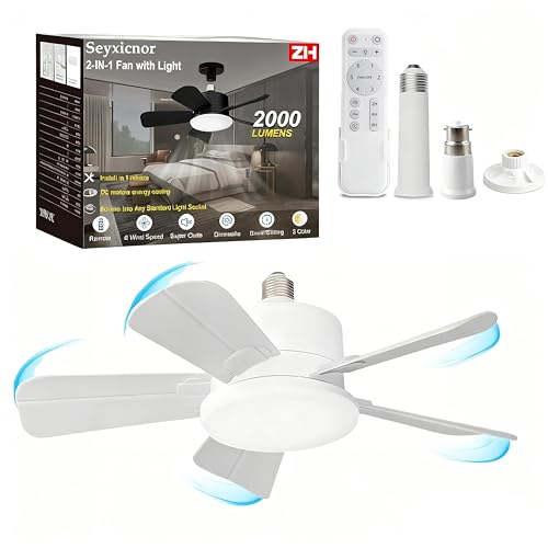 Ceiling Fan with Lights and Remote, Fits E27/B22 Socket, 2000LM 3CCT Dimmable 6-Speed Reversible, Quiet LED Fan Light Ceiling for Bedroom Kitchen Garage, with 2 Extension Rods & Mounting Base