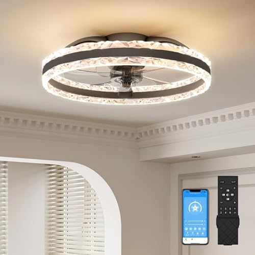 20" Modern LED Ceiling Fan with Lights Dimmable Acrylic Dimmable Low Profile Ceiling Fan Flush Mount Bladeless Chandelier Fan Stepless Color Temperature Change and 6 Speeds (White)
