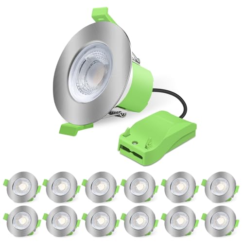 ALUSSO Fire Rated LED Downlights 6W 600lm, 3CCT Colors Warm Neutral Cool White Selectable Recessed Ceiling Lights Dimmable, Spotlights IP65 for Bathroom Kitchen Living Room, Brushed Nickel 12 Pack