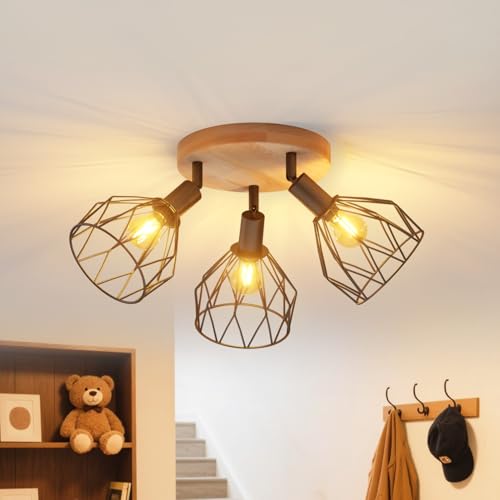 LVWIT Black Ceiling Light,Wood Spot Light Fittings Ceilings,3 Way Adjustable SpotLights Ceiling Lights Wire Cage with E14 Base,Cage Ceilings for Kitchen Living Room(NO Bulbs)