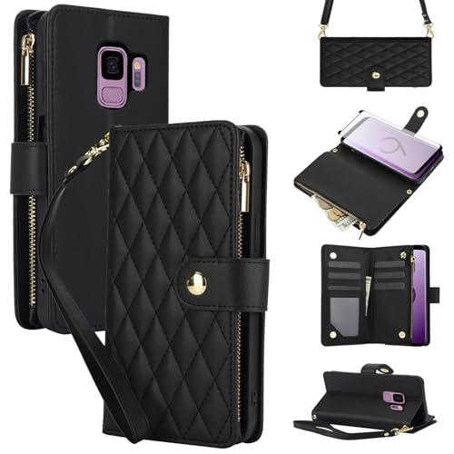 Asuwish Phone Case for Samsung Galaxy S9 with Tempered Glass Screen Protector and Zipper Wallet Cover Card Holder Slot Stand Flip Wrist Strap Mobile Cell Accessories S 9 Edge 9S GS9 Women Men Black