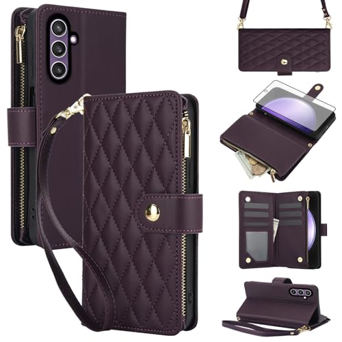 Asuwish Phone Case for Samsung Galaxy S23 FE 5G with Tempered Glass Screen Protector and Zipper Wallet Cover Card Holder Slot Stand Flip Mobile Cell Accessories S 23 EF S23FE 23S Women Men Dark Purple