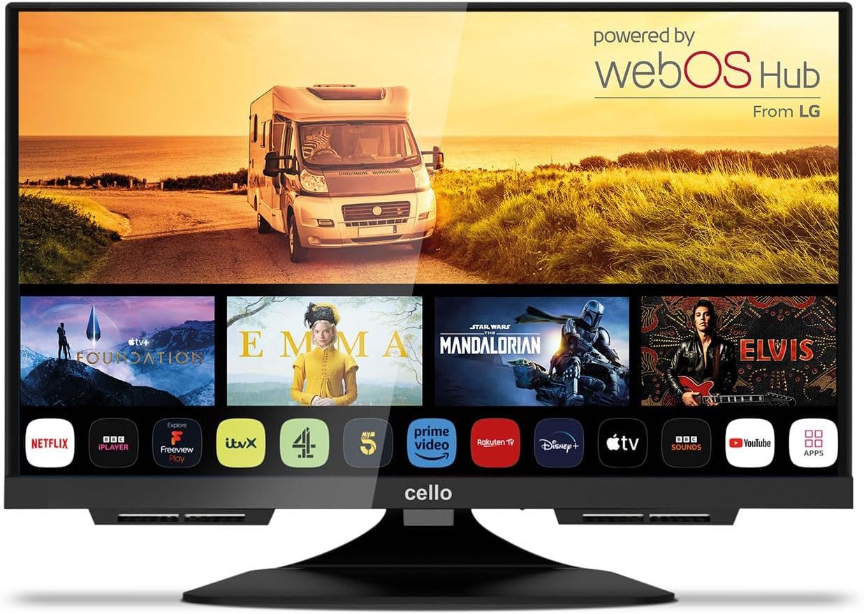 Cello 12 Volt 32 inch Traveller Smart TV Made in UK Ultrafast WebOS, Freeview Play, FreeSat, Bluetooth, Netflix, Prime Video, Apple TV, BBC. Camperva