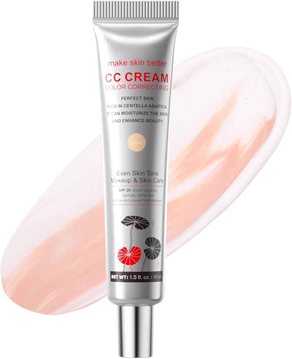 Color Correcting CC Cream with Centella Asiatica Full-Coverage Foundation with SPF 25, Even Skin Tone Makeup and Skin Care, Long Lasting Concealer, Light 45ml
