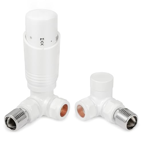 VANCOCO Glossy White Thermostatic Radiator Valves 15mm (TRV) with Lockshield, 1/2"×15mm Corner Radiator Thermostat Valve, H62 Brass, Energy Saving Modern TRV for Central Heating Syetem