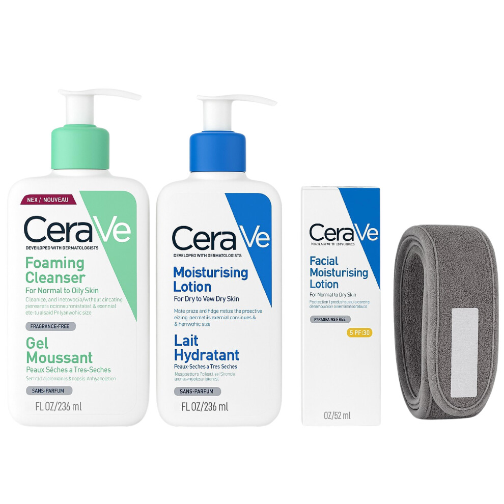 CeraVe Skincare Set: Cleanser, Moisturisers SPF30, Headband, 4pcs