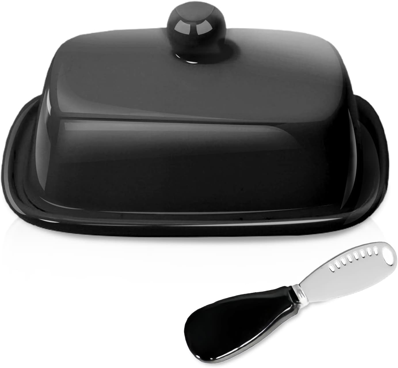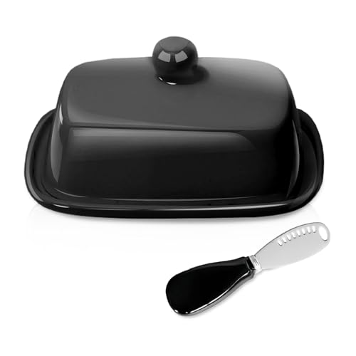 Butter Dish with Lid, Ceramic Butter Dish with Knife 640ml Large Capacity with Double Silicone Seals for Better Freshness Perfect for Room Decor Kitchen Decor Black