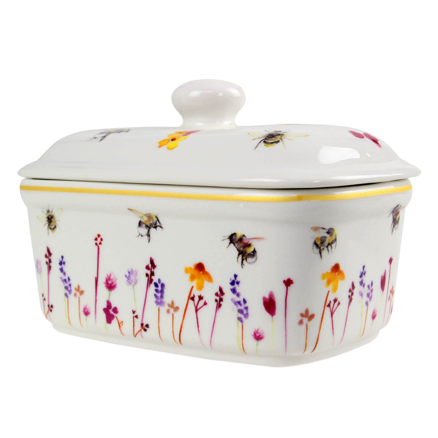 Bees & Flowers Ceramic Butter Dish w/ Lid Floral Print by Jennifer Rose