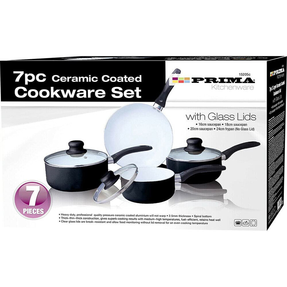7 Pcs Prima Ceramic Coated Aluminium Black Cookware Set Non-Stick Saucepan with Glass Lid Pot Home Kitchen Chef Healthy Food Cooker Frying Pan Frypan