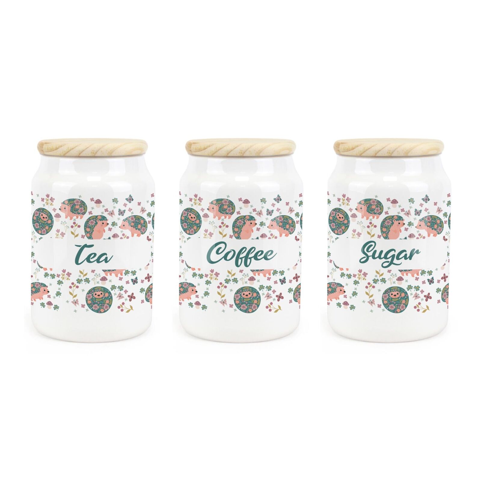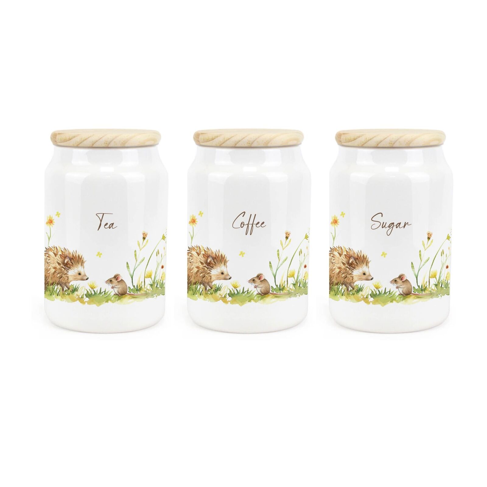 Ceramic Tapered Hedgehogs & Flowers Canisters - Tea, Coffee & Sugar Containers