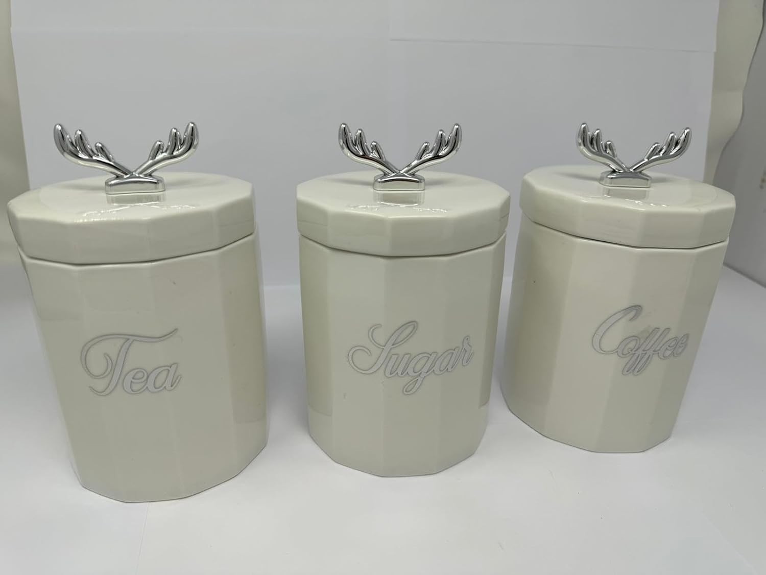 Set Of 3 White & Silver Tea Coffee Sugar Ceramic Canisters, kitchen Storage jars