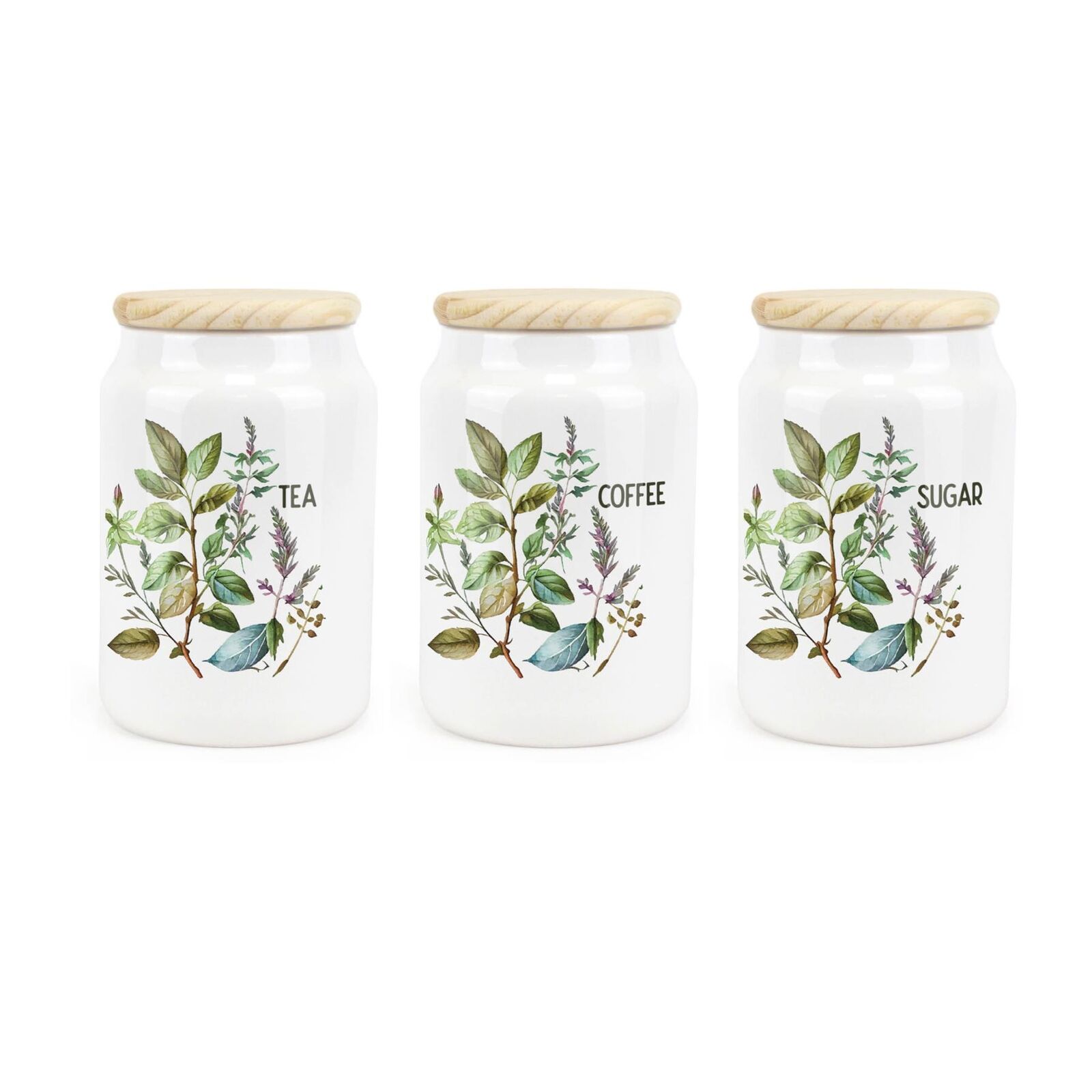 Ceramic Tapered Watercolour Herbs Canisters - Tea, Coffee & Sugar Containers
