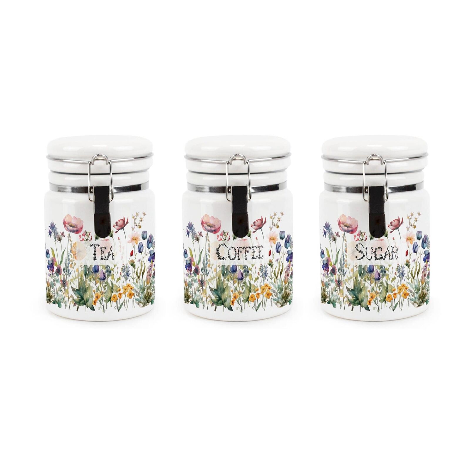 Ceramic Clip-Lid Wildflowers Canisters - Tea, Coffee & Sugar Containers