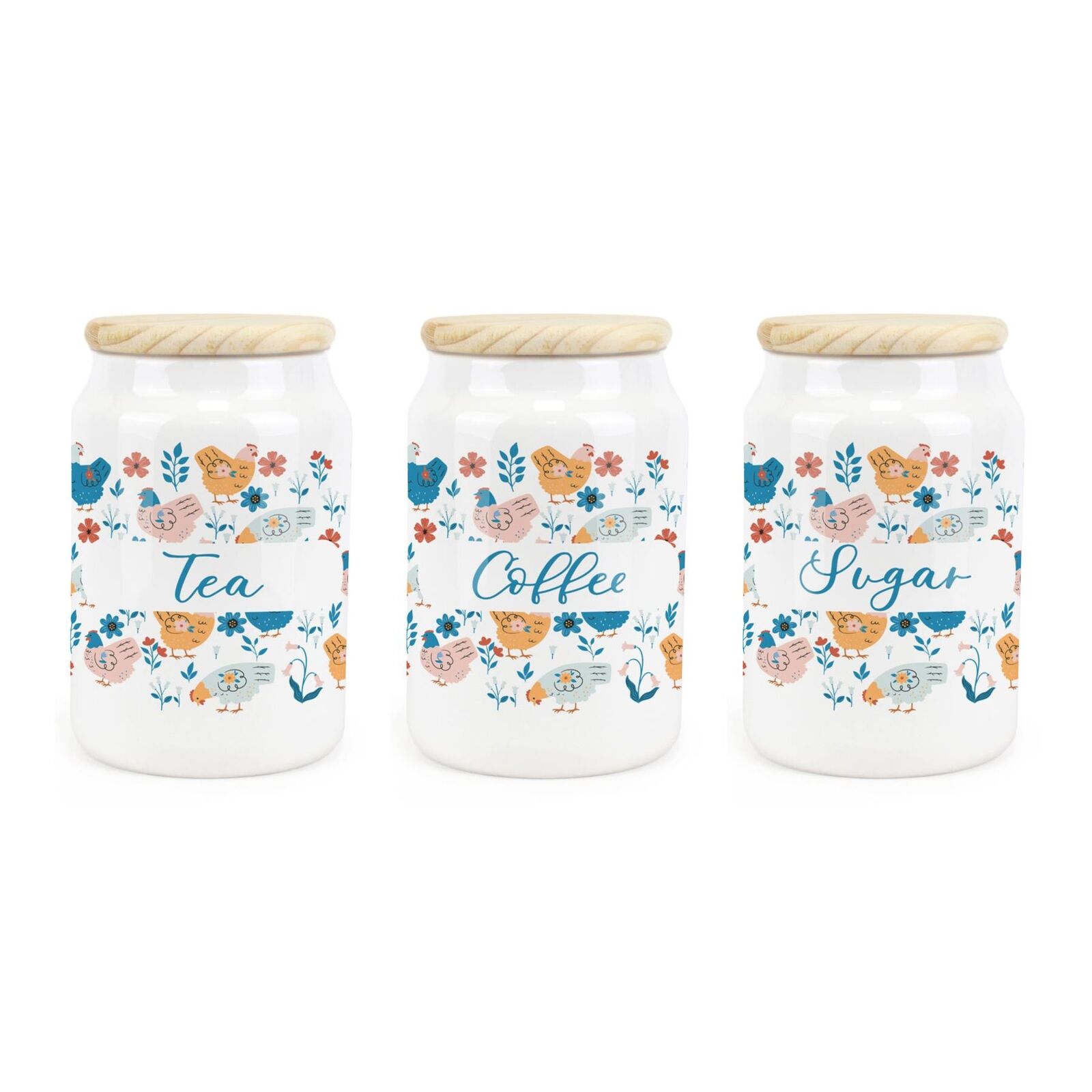 Ceramic Tapered Botanical Chickens Canisters - Tea, Coffee & Sugar Containers