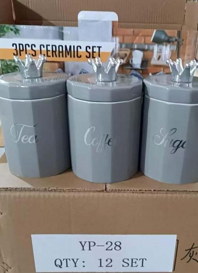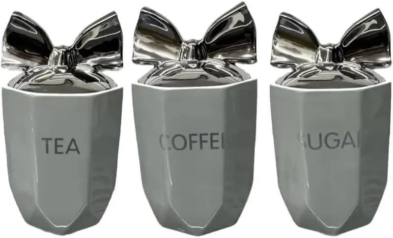 Set Of 3 Ceramic Tea Coffee Sugar Canisters JarsStorage Jars Pots with Grey