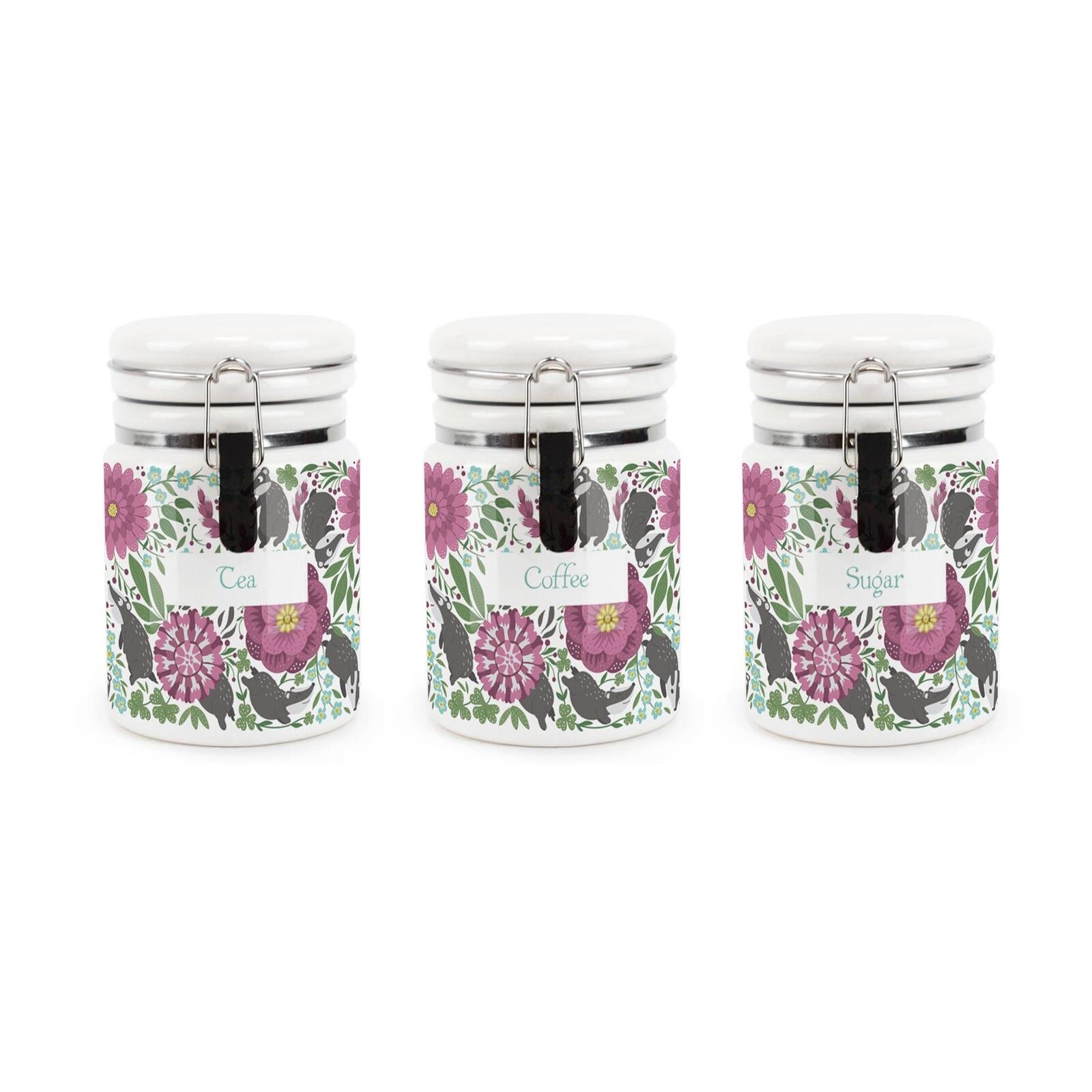 Ceramic Clip-Lid Floral Badgers Canisters - Tea, Coffee & Sugar Containers